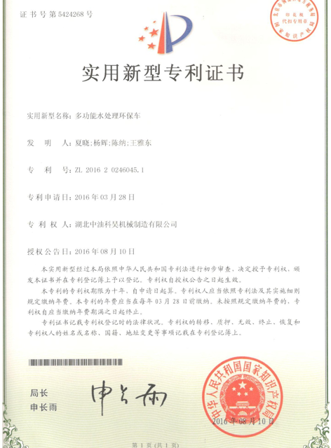 中油科昊屬于第四屆湖北省環(huán)境保護產(chǎn)業(yè)協(xié)會常務(wù)理事單位;通過ISO9000審核獲得油田廢水、廢油、廢油泥、壓裂返排液處理環(huán)保設(shè)備的設(shè)計及生產(chǎn)資質(zhì);獲得環(huán)境污染治理資格證書;2016年,公司生產(chǎn)的壓裂液返排車獲得湖北省重大科技專項??脐粓猿譃橛脩舸蛟靸?yōu)質(zhì)、專業(yè)、定性化石油環(huán)保解決方案,更好的為客戶創(chuàng)造品質(zhì),讓用戶獲得價值。